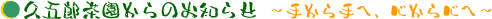 久五郎茶園はお茶と古老柿を生産する農家です。農作物は通常、市場経由で一般に出回るため生産者と消費者の間には大きな距離があります。私たちはその距離をなるべく短くし、消費者の方々と心が通じ合うような関係を築いていきたいと思っています。