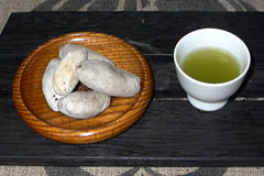 宇治田原町には古くから「つるの子柿」が植えられていました。ある日、ひとりの少女が白い粉を帯びた干し柿「孤娘(ころ)柿(がき)」を携えて売っていました。白い粉は雪の如く、風味はまた甘美なので里人は、その製法を少女に聞き伝授を受けました。